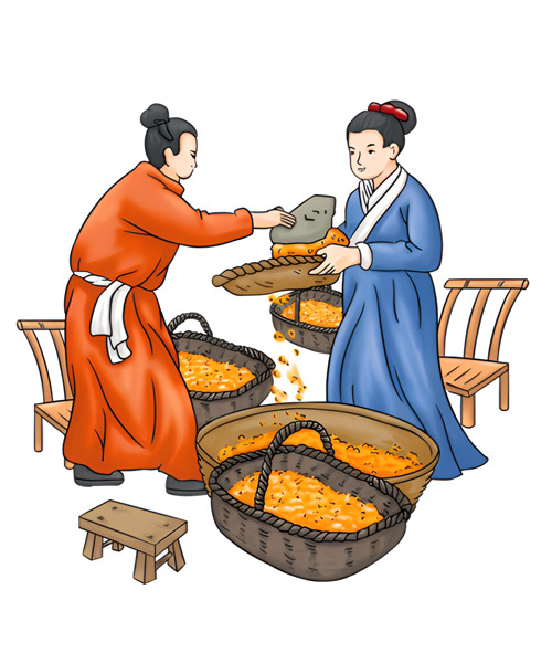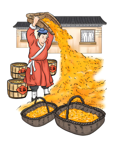 - 漂洗后的芝麻,以鐵鍋碳火慢炒至香味溢出。其中炒芝麻的手法、火候及加料工藝等,都以獨(dú)特的秘訣形式由師徒間代代傳承。